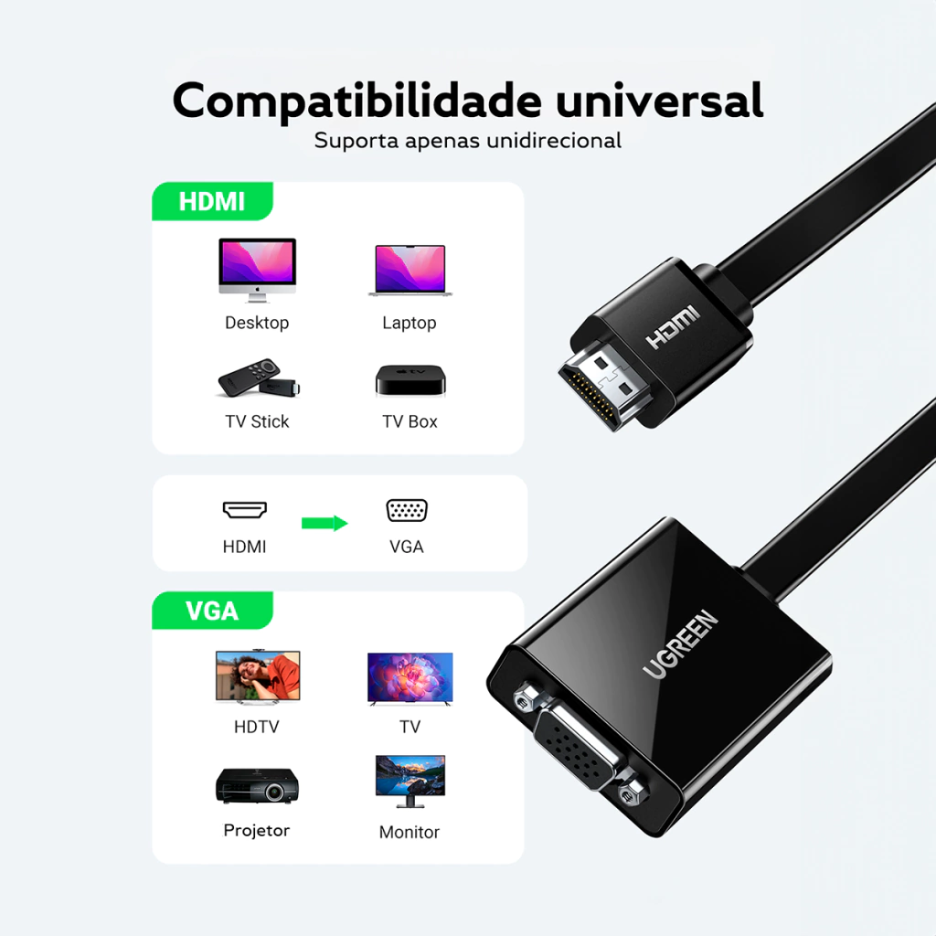 Atenção: Não é bidirecional. Requer cabo VGA macho a macho (vendido separadamente).